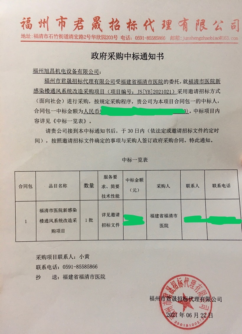 祝賀公司中標(biāo)福清市醫(yī)院新感染樓新風(fēng)改造項(xiàng)目